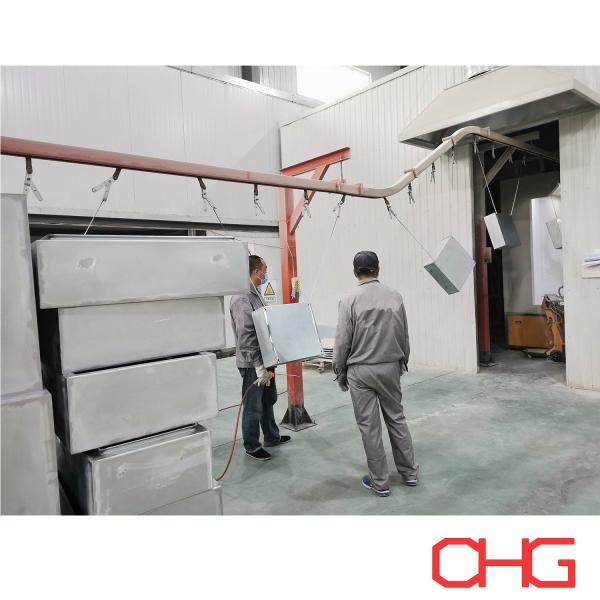This powder coating production line sprays sheet metal parts of different sizes and shapes for the electric control cabinet chassis.